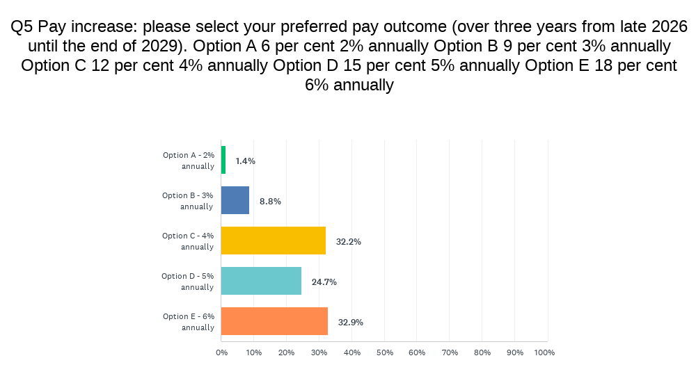 - Pay increase: please select your preferred pay outcome over three years (4 per cent 32.2%, 5 per cent 24.7%, 6 per cent 32.9%)